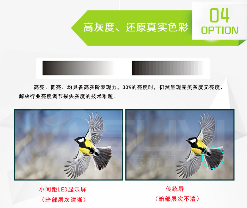 1、P1.562全彩顯示屏采用四燈合一HD LED封裝技術(集成SMD+COB優點),該技術解決墨色一致性、拼接縫、漏光、維修等問題,同時具備高對比度、高集成、易維護、耐撞擊、防串光等特點。