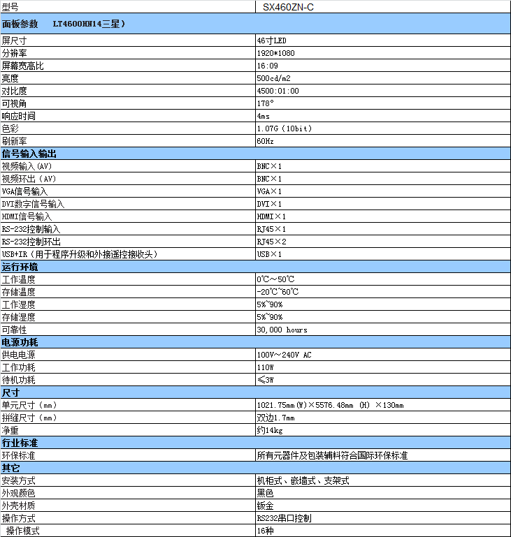 46寸3.5mm液晶拼接屏技術參數: