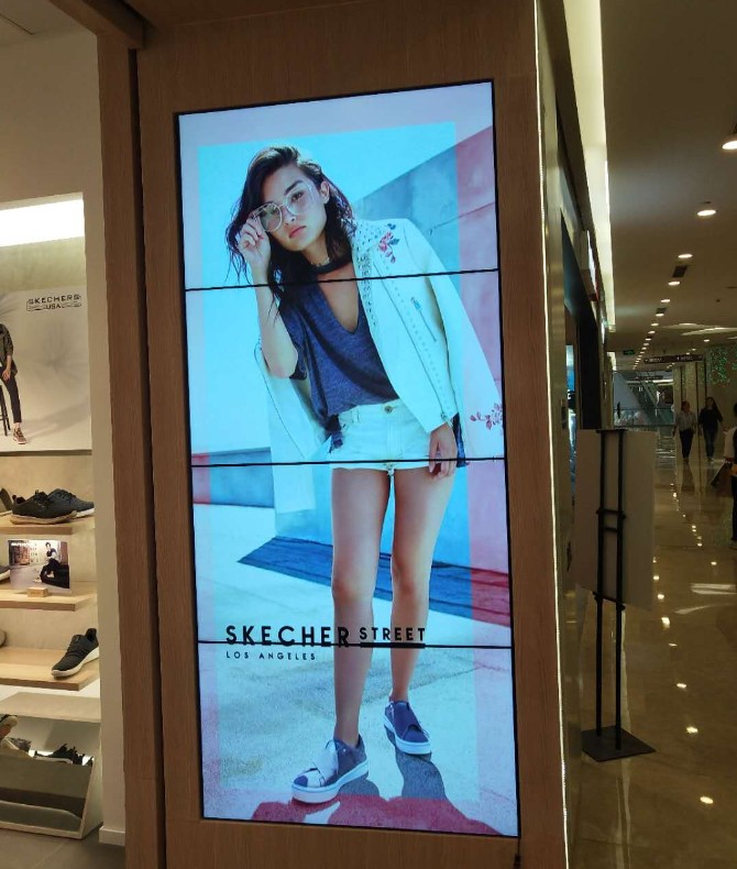 下面這個(gè)1*4的豎屏拼接屏是由上海素希為斯凱奇某門(mén)店做的拼接屏宣傳方案: